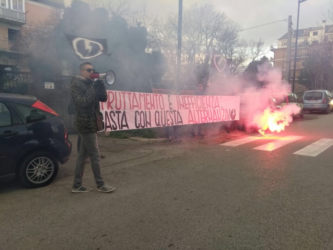 Pescara, 2 febbraio: "Sfruttamento e inefficienza: basta con questa alternanza!", recita così lo striscione dei militanti del Blocco Studentesco mostrato stamattina durante il blitz davanti all’Istituto Tecnico "Tito Acerbo" per denunciare ancora una volta l'assurda gestione dell'alternanza.