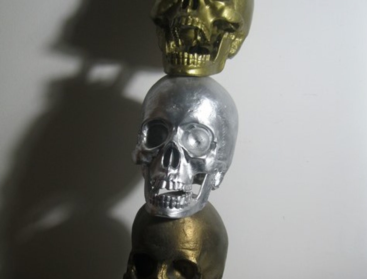 I baratri profondi non si sa quanto, sono intasati da rifiuti, macchine, armi belliche e da un ammasso inverosimile di salme. Cadaveri calcati e a più livelli che l’artista ha interpretato con tre crani sovrapposti con la mandibola aperta come se volessero ancora urlare vendetta. Ecco che Guadagnuolo presenta tre teschi umani riemersi dalle tenebrosità di queste inquietanti cavità rocciose. Dunque persone umane, teschi defunti abbandonati e dimenticati. Ogni cranio scandito da tre colori come per simboleggiare Trieste, Istria e ‘Venezia Giulia’, uno al di sopra dell’altro, schiacciati dal peso dell’inumana follia disposta dal generale comunista jugoslavo Tito. Inoltre i tre teschi-cimeli indicano la memoria come dire che non va dimenticata, le ragioni, il perché di tanto orrore? Ed infine la verità che va ancora ricercata dal punto di vista politico-storico con conseguenti responsabilità.