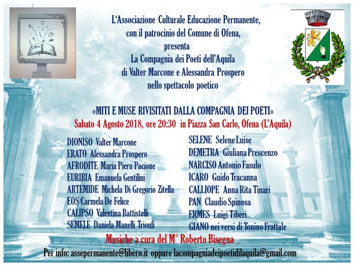 16 personaggi mitologici interpretati, scenograficamente e con dei testi a tema, da altrettanti poeti. Da un'idea di Alessandra Prospero, con il patrocinio del Comune di Ofena e dell'Associazione Culturale Educazione Permanente. Durante lo spettacolo si esibirà il M° Roberto Bisegna, noto musicista abruzzese. Parteciperanno i poeti: Valter Marcone, Alessandra Prospero, Maria Piera Pacione, Emanuela Gentilini, Luigi Tiberi, Antonio Fasulo, Carmela De Felice, Anna Rita Tinari, Selene Luise, Guido Tracanna, Claudio Spinosa, Giuliana Prescenzo, Michela Di Gregorio Zitella, Valentina Battistelli, Daniela Manelli Trionfi e Tonino Frattale con i suoi versi. Ingresso libero.