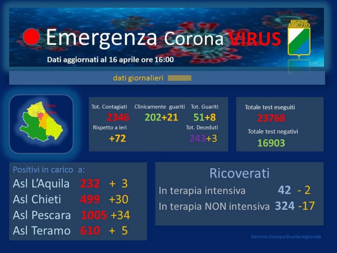 Nella giornata di ieri (15 aprile) i positivi erano stati 29, su un totale di 848 tamponi (3.4 per cento). 324 pazienti (-17 rispetto a ieri) sono ricoverati in ospedale in terapia non intensiva (46 in provincia dell’Aquila, 87 in provincia di Chieti, 128 in provincia di Pescara e 63 in provincia di Teramo), 42 (-2 rispetto a ieri) in terapia intensiva (13 in provincia dell’Aquila, 9 in provincia di Chieti, 12 in provincia di Pescara e 8 in provincia di Teramo), mentre gli altri 1484 (+59 rispetto a ieri) sono in isolamento domiciliare con sorveglianza attiva da parte delle Asl (123 in provincia dell’Aquila, 301 in provincia di Chieti, 649 in provincia di Pescara e 411 in provincia di Teramo).