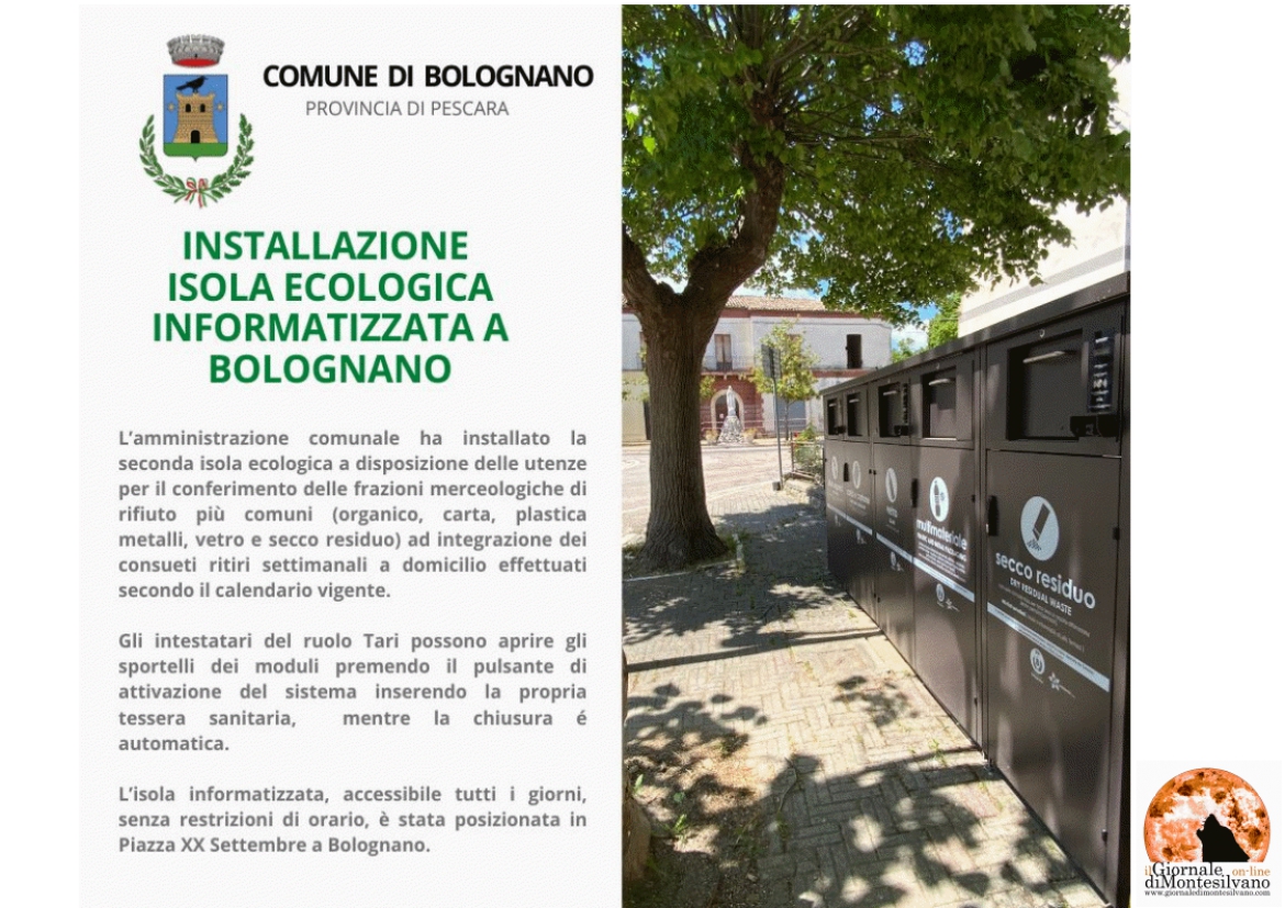 Sono state completate, a Bolognano, le attività di installazione della seconda isola ecologica informatizzata che Ambiente S.p.A., in accordo con l'Amministrazione Comunale, mette a disposizione delle utenze per il conferimento delle frazioni merceologiche di rifiuto più comuni (organico, carta, plastica/metalli, vetro e secco residuo) ad integrazione dei consueti ritiri settimanali a domicilio effettuati secondo il calendario di raccolta fornito agli utenti.