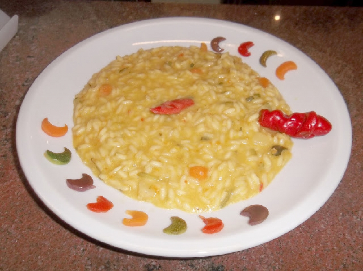 Riso Carnaroli – porro – zucchina - peperone rosso – carota – melanzana - zucca frullata a crema da aggiungere nel brodo - vino Pecorino brut - olio E.V.O. - burro - Parmigiano grattugiato. Per esaltare il colore ed il sapore, aggiungere lo zafferano ed il zenzero in polvere.