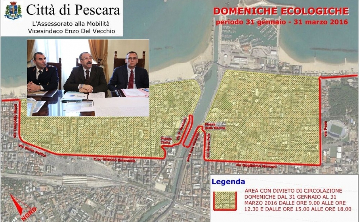 “Il perimetro è ampio, ma muoversi sarà possibile lugo le direttrici principali che consentono di arrivare ai maggiori parcheggi – aggiunge Enzo Del Vecchio – Viale Muzii e viale Pepe i confini a nord e sud, via Gugliermo Marconi e Corso Vittorio Emanuele, la direttrice a ovest: tutto questo perimetro resta transitabile, eccezion fatta per il tratto di Corso Vittorio chiuso la domenica e per la linea rivierasca interessata su cui non si passa. Quella delle domeniche ecologiche è solo la punta dell'iceberg del problema, che stiamo cercando di affrontare con una serie di iniziative, alcune messe in atto e altre in fase di decollo per migliorare la qualità dell'aria. Abbiamo operato con l'abbassamento della temperatura del riscaldamento e sulla velocità; i lavaggi delle strade; abbiamo provato con la limitazione ai mezzi “anziani” e con le targhe alterne, vogliamo affrontare il fronte della qualità della vita, mettendo mano alla qualità dell'aria, provando anche la carta della domenica ecologica. Ma non senza alternativa: la prima immediatamente possibile è il Biglietto Unico, un risultato eccezionale, per ora sperimentale per due giorni, ma nell'immediatezza ci è sembrato opportuno cogliere questa disponibilità da parte di TUA intanto per il fine settimana. I parcheggi cittadini saranno tutti accessibili, dentro l'area circolano gli autobus.