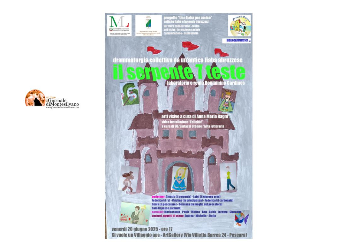 Venerdì 20 giugno alle 17 presso Ci vuole un Villaggio aps - ArtGallery (Via Villetta Barrea 24, Pescara). I ragazzi e le ragazze di “La Casa di Cristina odv” presenteranno la performance “Il serpente 7 teste” riscrittura drammaturgica collaborativa a partire da un’antica fiaba abruzzese medievale. Regia e laboratorio a cura di Beniamino Cardines. Arti visive a cura di Anna Maria Ragni. Video installazione a cura di SU/Sintassi Urbane rivista letteraria.
