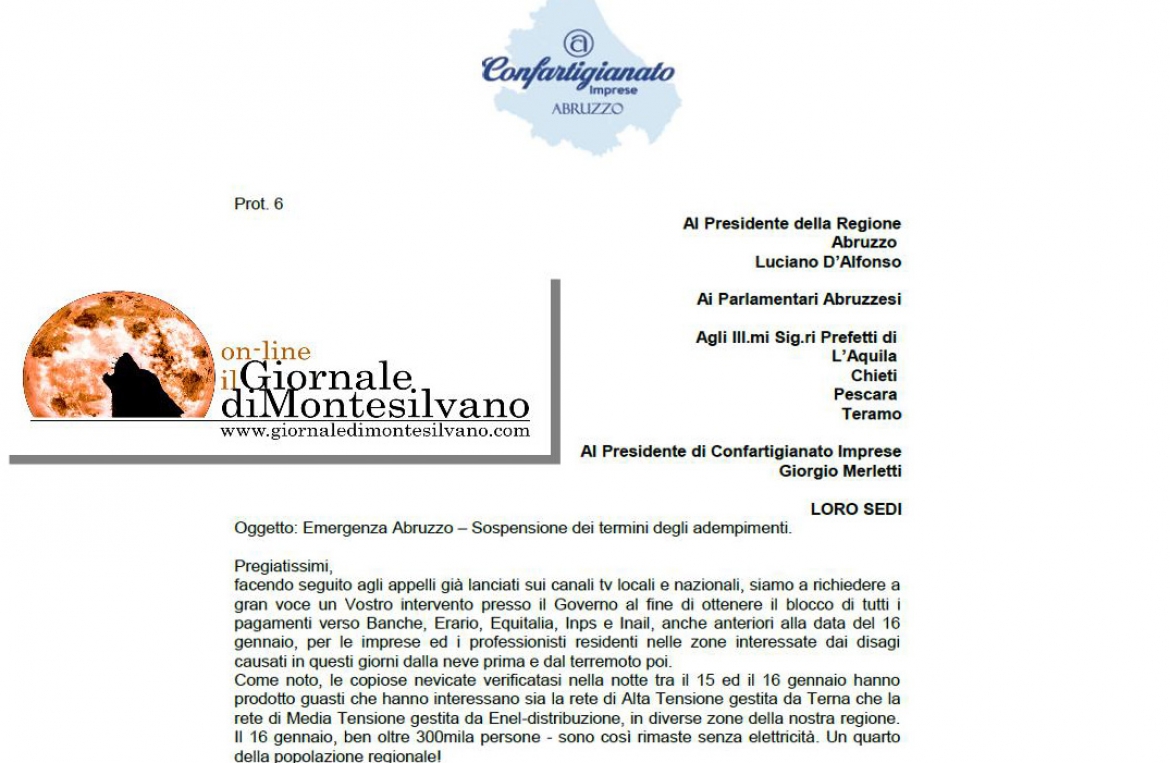 Abruzzo Confartigianato ha inviato una lettera al presidente della Regione Abruzzo, Luciano D'Alfonso, ai Prefetti di L'Aquila, Chieti, Pescara e Teramo, ai parlamentari abruzzesi e al presidente nazionale di Confartigianato, Giorgio Merletti, per chiedere "un intervento presso il Governo al fine di ottenere il blocco di tutti i pagamenti verso Banche, Erario, Equitalia, Inps e Inail, anche anteriori alla data del 16 gennaio, per le imprese ed i professionisti residenti nelle zone interessate dai disagi causati in questi giorni dalla neve prima e dal terremoto poi".