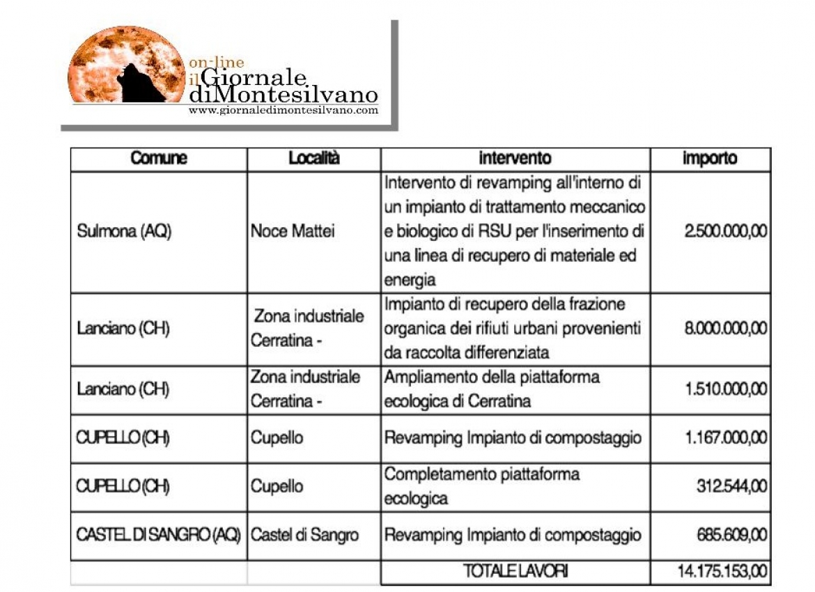 Nel dettaglio gli interventi sono indirizzati a: Sulmona, Lanciano, Cupello, Castel di Sangro