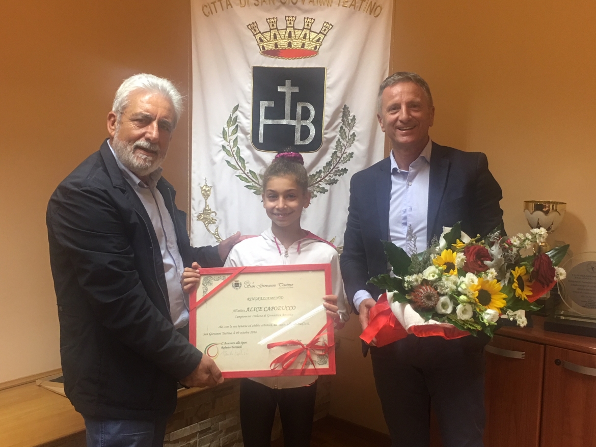 Ieri pomeriggio, nella sala giunta del Comune, la ginnasta Alice Capozucco ha ricevuto una pergamena e un mazzo di fiori dal Sindaco Luciano Marinucci, dal Vicesindaco Giorgio Di Clemente e dall’Assessore alle Politiche Giovanili Simona Cinosi, come riconoscimento per i suoi successi sportivi nella disciplina della Ginnastica Ritmica. Alice, studentessa di terza media di appena 12 anni, è salita alla ribalta nazionale nell’aprile scorso, conquistando il primo posto nella fase finale del Campionato nazionale Gold, categoria Allieve, con la scuola teatina Armonia d’Abruzzo. Prima di allora, Alice aveva conquistato il gradino più alto del podio alle Regionali e si era classificata quinta agli Interregionali di categoria. "Ho realizzato un sogno che inseguo da quattro anni - ha detto Alice - e per questo ringrazio le mie maestre Germana, Anna e Maria, ma soprattutto la mamma e i nonni che mi sono stati e mi sono sempre vicini, anche durante estenuanti allenamenti, fino a sei ore al giorno". "Il percorso di Alice - ha dichiarato il Sindaco Marinucci - dimostra come il talento, unito alla determinazione e all’amore per lo sport, possa portare a raggiungere grandi traguardi. Credere nelle proprie potenzialità, affidarsi alle insegnanti e cogliere i valori più profondi di ciascuna disciplina sportiva, è il segreto per emergere e migliorarsi costantemente. Noi saremo sempre vicini e attenti a riconoscere queste eccellenze della nostra comunità, perchè diventino modello e stimolo per i loro coetanei. Ad Alice vanno i complimenti da parte di tutta l’Amministrazione Comunale”.