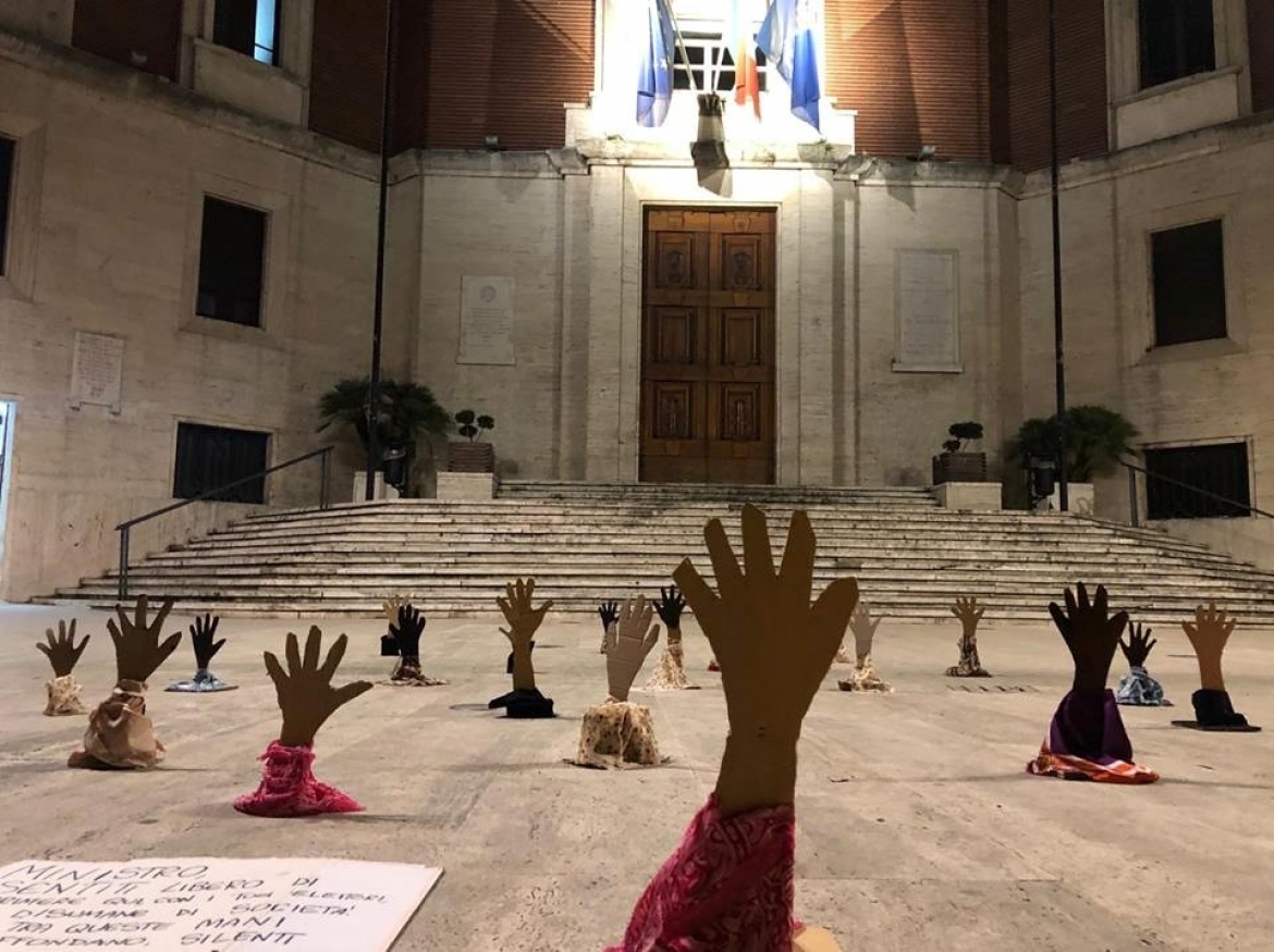 Dopo Atri anche Pescara accoglie Salvini con l'installazione artistica delle mani che annegano, posizionate questa mattina all'esterno del comune di Pescara.