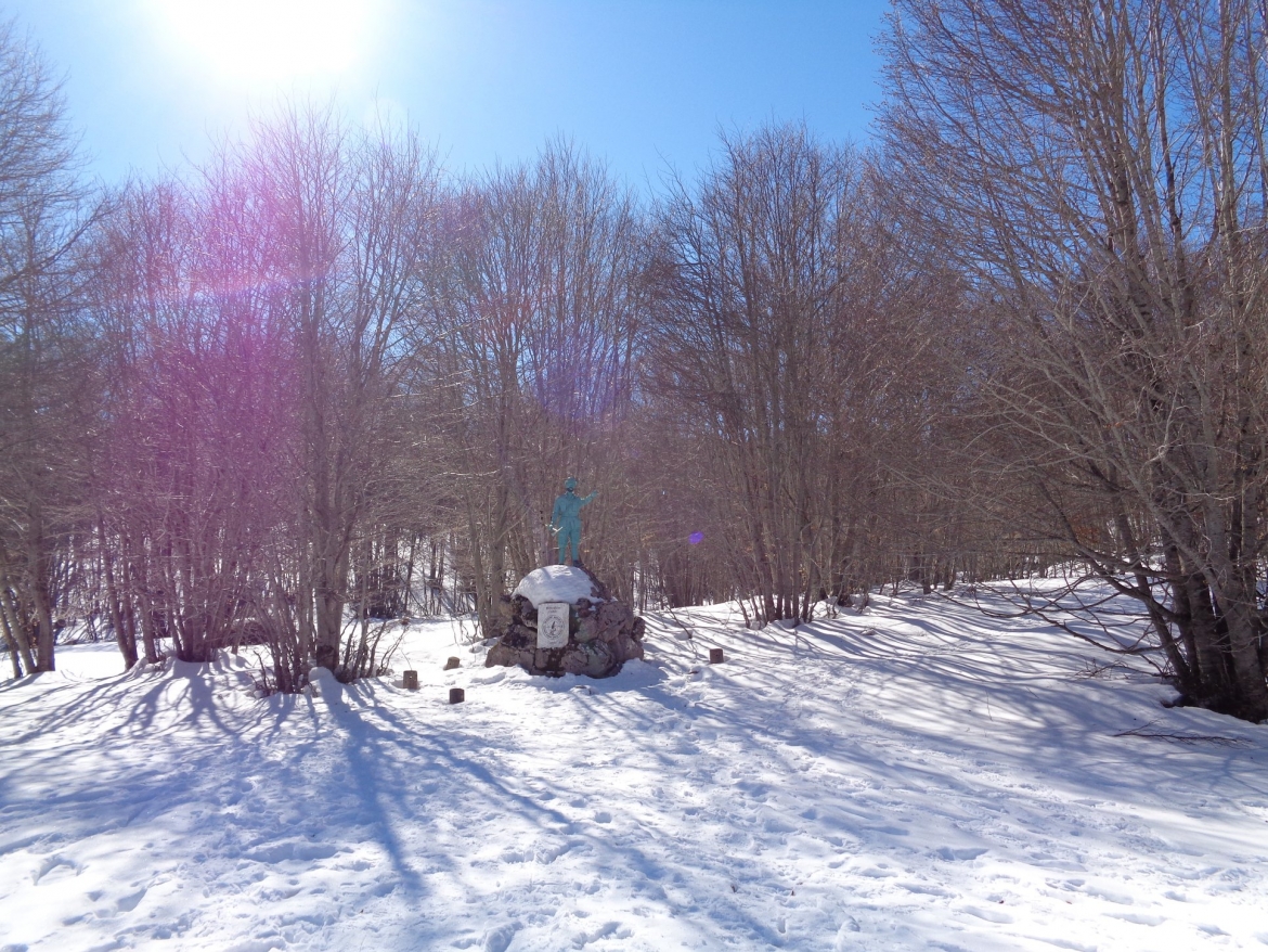 È consigliato anche l’uso delle ciaspole. Per spiegare la qualità della neve non trovo un sostantivo appropriato, quindi la definisco… “DA GRIDO”. Scivolosa, veloce, sicura, il tutto abbellito dal panorama, dal sole, dal silenzio. L’anello Voltignolo – Voltigno, è una classica. Si parte dal Rifugio Bufara (1343 m) e si prende la traccia a sinistra che raggiunge il Voltignolo e la statua dell’alpino. Superato il laghetto con lo stazzo, si entra nel pianoro del voltigno, dove ci sono molti laghetti carsici, ora coperti dalla neve. L’unico visibile è il Lago Sfondo (1354 m), che segna il confine tra la provincia dell'Aquila e quella di Pescara. Una leggenda racconta che questo lago deve il suo nome a una credenza popolare. Il lago è senza fondo e trasporta le sue acque direttamente nel mare! Si arriva al Vado di Focina (1383 metri) e quindi al Rifugio Bufara (1343 m).