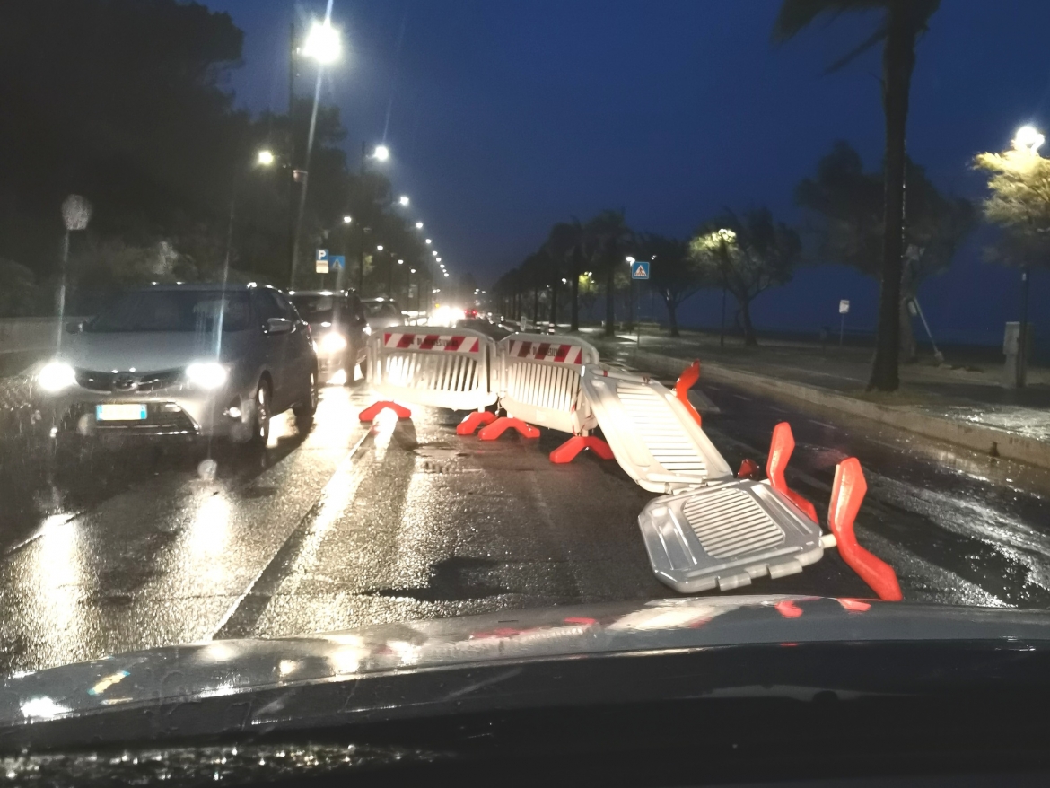 Si legge nella mail, in riferimento alle foto allegate: "è possibile vedere come le transenne posizionate sul lungomare in sostituzione dei cordoli, rimossi per il concerto privato di Jovanotti dello scorso 7 settembre, sono state rovesciate dal vento e occupano quasi tutta la sede stradale con grave pericolo per la circolazione (che procede in maniera alternata)". Inoltre fa sapere, che "Per senso civico ho chiamato subito il 112. Mi è stato detto che avrebbero avvisato la polizia locale".