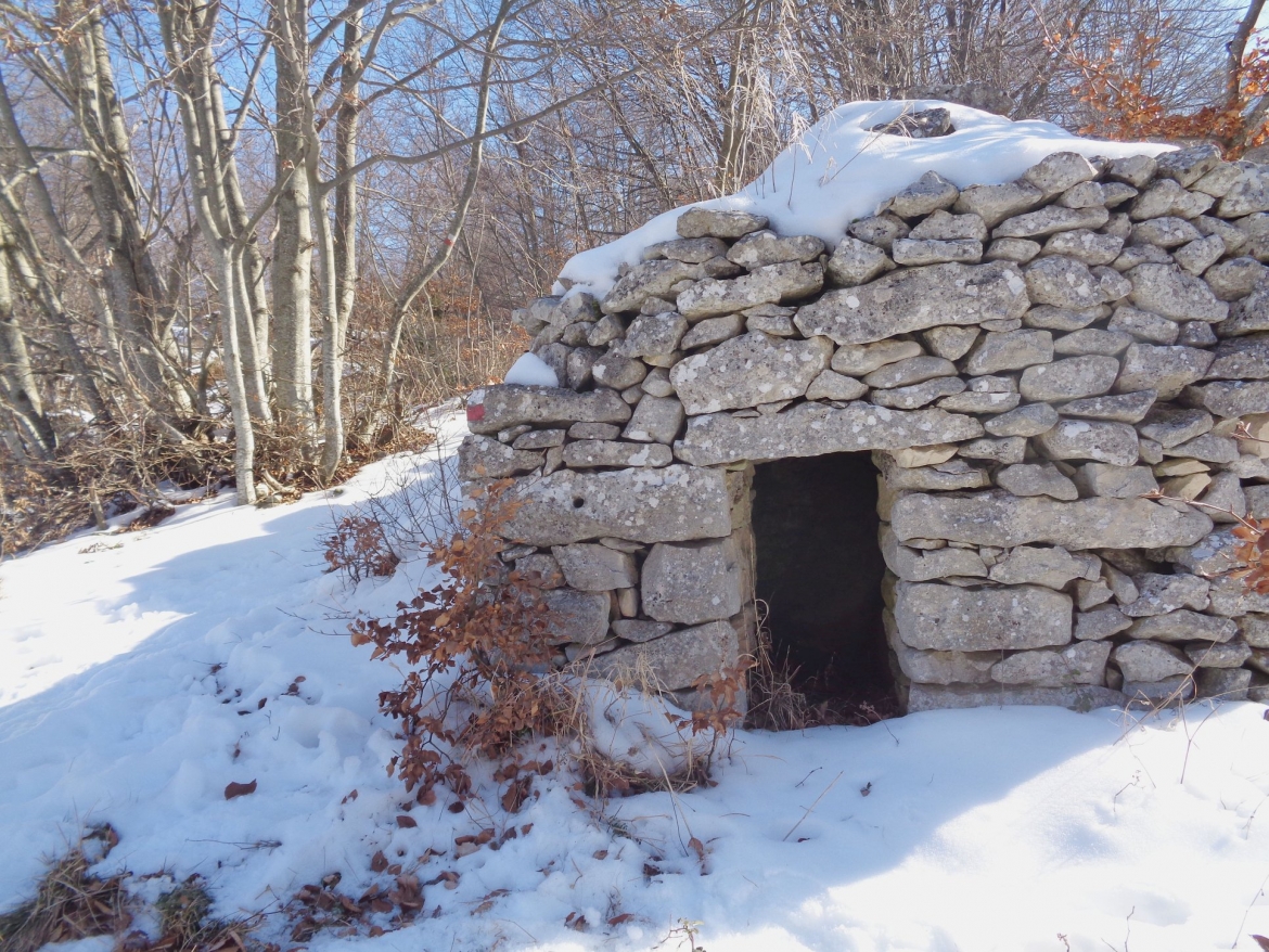 Si può ciaspolare, ma scegliendo un itinerario con neve non gelata. La scelta è stata il sentiero CP (Capanne pastorali), con inizio a Passo Lanciano (1318 m) nel parco nazionale della Maiella. La maggior parte delle capanne in pietra a secco, denominate “pajare” (pagliaio), sono state costruite con una pianta circolare di forma ogivale. Dallo spietramento del terreno che serviva per renderlo fertile ed essere coltivato, è stata ricavata “la pietra a secco”, per realizzare la struttura, senza l'aiuto di alcuna malta o rinforzo, oltre che all’intelligenza e alla maestria dell’uomo. Per la costruzione della parte conica, hanno usato la tecnica “aggettante. In ogni anello orizzontale per innalzare la cupola, diminuiva il raggio, ma grazie a questa tecnica, si evitava il ribaltamento e la caduta delle pietre, (aggettare, sporgere fuori). La copertura è stata lasciata aperta, per lo scarico dei fumi, durante l’accensione del focolare. Le capanne in pietra erano ricoveri AGROSILVOPASTORALI, abitate sia dai contadini che dai pastori, ed era anche un ricovero per gli animali. Pur essendo piccole costruzioni, avevano tutte … si fa per dire… le comodità. Il camino, il giaciglio, i piccoli ripostigli per depositare viveri ed attrezzi. La vita agricola è documentata dai tanti terrazzamenti realizzati con i muretti a secco, dove venivano coltivati cereali e si pensa anche la vigna.