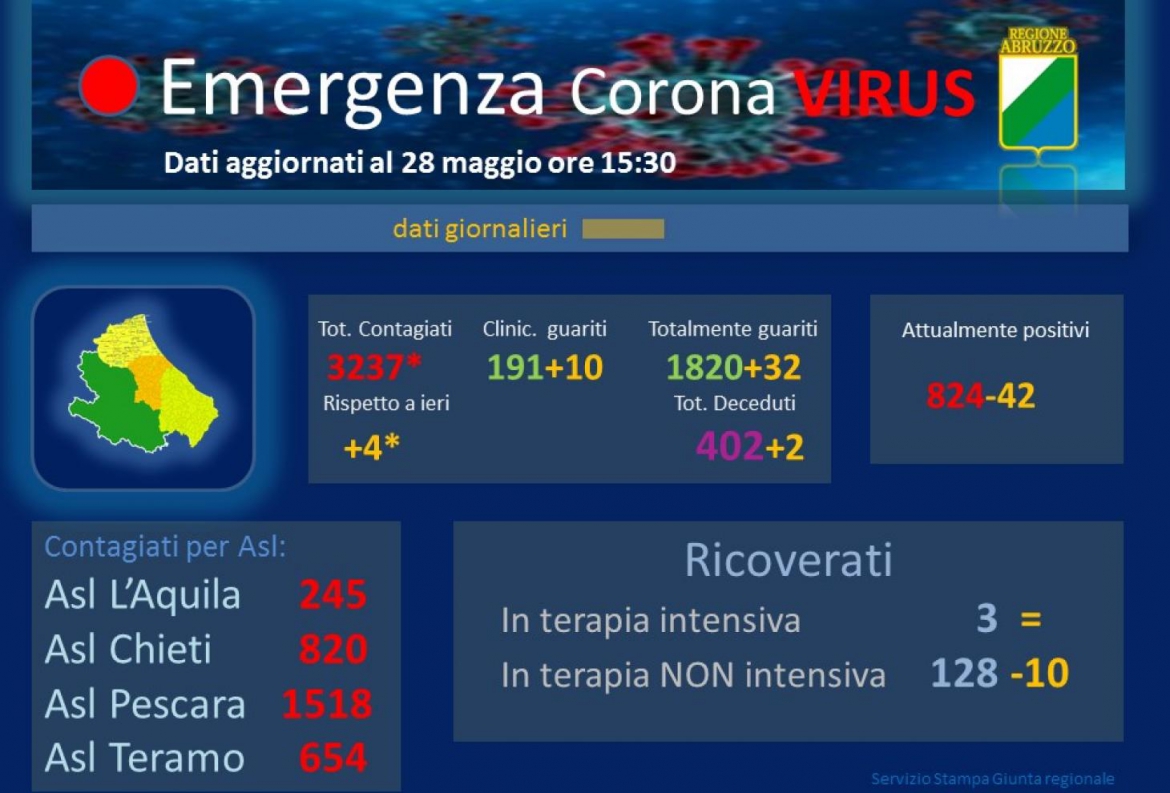 In Abruzzo, dall’inizio dell’emergenza, sono stati registrati 3237 casi positivi al Covid 19, diagnosticati dai test eseguiti nel laboratorio di riferimento regionale di Pescara, dall’Istituto Zooprofilattico di Teramo, dall’Università di Chieti e dal laboratorio dell’ospedale dell’Aquila.