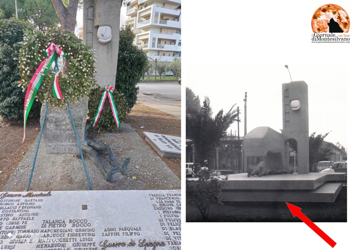 Guerino D'Agnese, montesilvanese, figlio dell'assessore Giuseppe che ebbe l'iniziativa di costruire il monumento ai caduti del 1968, con un bando che aveva in Giuria come presidente Vicentino Michetti, fa sapere, sul gruppo Piazzetta di Montesilvano, che la sagoma è stata spostata e fa notare che il doppio basamento originale è stato tolto. (foto) Il monumento era in Piazza Diaz, davanti a Municipio, ora riallocato in piazza Indro Montanelli, poco visibile, sono tanti i cittadini che lo rivorrebbero sul posto originario.