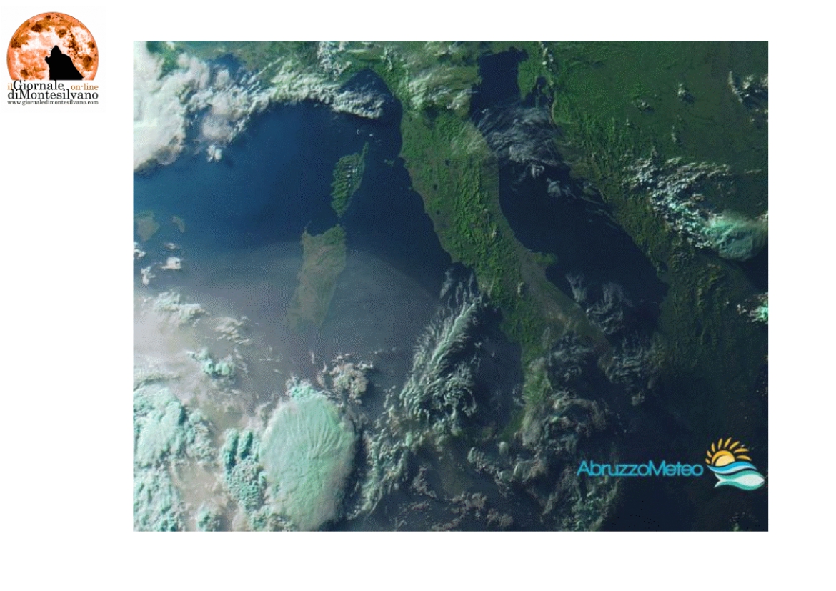 Sulla nostra regione si prevedono condizioni generali di cielo prevalentemente sereno o poco nuvoloso ma con la sabbia in sospensione che favorirà una colorazione biancastra del cielo. Atteso un nuovo aumento delle temperature e dei tassi di umidità con valori massimi che, sulla Valle Peligna, in Val Pescara, in Val di Sangro e, localmente, nell'Aquilano, potranno raggiungere i +36°C/+38°C. Un ulteriore aumento delle temperature è atteso tra martedì e mercoledì. Afa in aumento lungo la fascia costiera, dove i valori di temperatura saranno meno elevati rispetto alle zone interne. Poche novità nel corso della giornata di martedì.