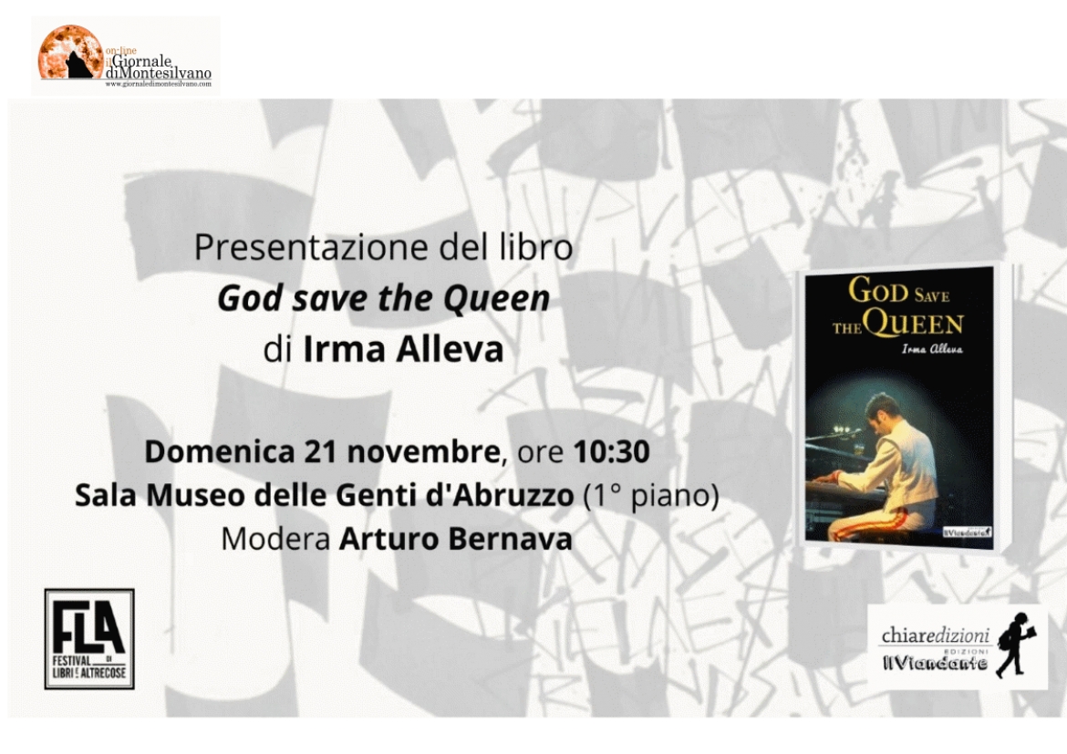 Pescara. Nell'ambito della diciannovesima edizione del Fla, Festival di libri e a altre cose, domenica 21 novembre 2021 alle ore 10.30 presso il Museo delle Genti D'Abruzzo (Sala Video - Primo piano) si terrà la presentazione del nuovo romanzo di Irma Alleva, God Save the Queen firmato Edizioni Il Viandante. L'evento sarà moderato dall'editore Arturo Bernava, il quale ripercorrerà insieme all'autrice i tratti salienti ed emozionanti di questo libro ispirato alle rocambolesche vicende di vita di Diego Regina, front man dei Regina Queen tribute. L'ingresso è gratuito, sarà necessario esibire il Green pass e il totale rispetto delle normative contenimento covid 19. SINOSSI - “Ma tu perché non ti fai crescere i baffi e ti metti a fare Freddie Mercury, sei uguale!” disse Franco Zanetti (direttore di Rockol) a Diego Regina. “Da qui tutto ha inizio, da qui Diego Regina diventa l’interprete del repertorio dei Queen come frontman dei Regina Queen Tribute, cover band dall’incredibile seguito di pubblico e dall’inequivocabile talento che li condurrà alla finale del programma televisivo Italia’s Got Talent. Diego, Andrea, Davide e Damiano all’apice del successo e reduci dall’esperienza televisiva soddisfacente, tornano nel loro amato Abruzzo per pianificare le date di un tour fitto di appuntamenti, anche fuori dall’Italia. Lo scenario dentro il quale Diego si muove brilla delle migliori aspettative, una luce tanto forte da poter accecare e così in una maledetta notte di settembre, di rientro da un concerto, la macchina sulla quale viaggia la band esce fuori strada. Tutti illesi tranne Diego che riporta i danni peggiori, trauma cranico e coma, una lenta e dolorosa degenza, un conseguente cambiamento fisico e vocale. L’incidente segna la linea di confine tra un prima e un dopo. L’amore tormentato, l’assuefazione all’alcool, le notti brave diventano un ricordo malinconico e nella sua seconda esistenza Diego si scopre un uomo nuovo, attraversa il buio pesto ma con la grinta e la tenacia da rocker in fondo, mai abbandonate, ritorna ad occupare il posto d’onore nel cuore dei suoi fans. God Save the Queen è una storia intensa, fatta di musica e di sogni, forte come le emozioni più vere, potente come il coraggio”.
