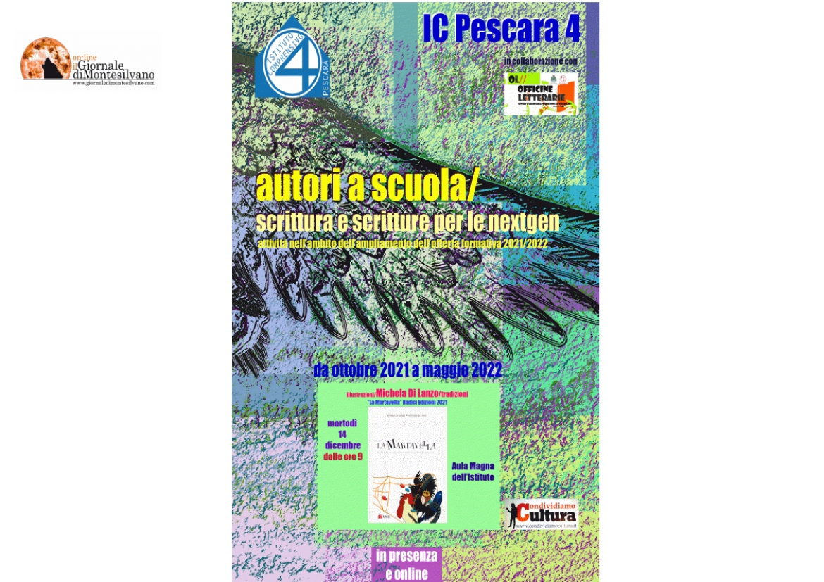 Martedì 14 dicembre Michela Di Lanzo, illustratrice, incontrerà gli alunni dell’ IC Pescara 4 – in presenza nell’Aula Magna dell’Istituto - nell’ambito della rassegna “Autori a scuola/scrittura e scritture per le nextgen” promossa dall’Istituto Comprensivo Pescara 4 in collaborazione con OL//Officine Letterarie – Centro studi, ricerca e promozione letteraria, rassegna che andrà avanti per sette mesi fino a maggio 2022.