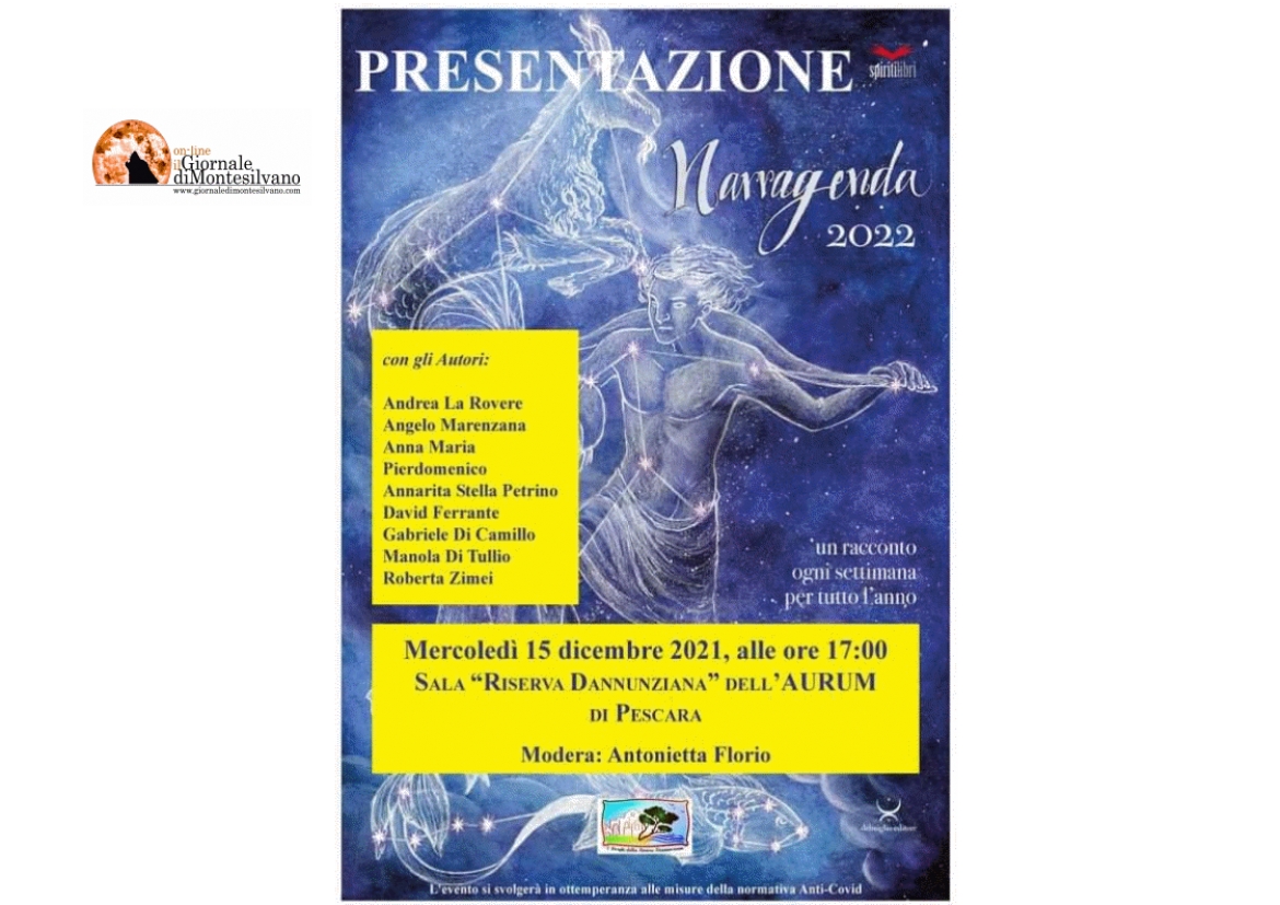 Ci sarà la presentazione di "NARRAGENDA 2022" a cura di Delmiglio editore. Cinquantaquattro storie brevi, un racconto ogni settimana per tutto l'anno. Saranno presenti gli autori: Andrea La Rovere, Anna Maria Pierdomenico, Gabriele Di Camillo, Manola Di Tullio e Roberta Zimei. Coordina: Antonietta Florio