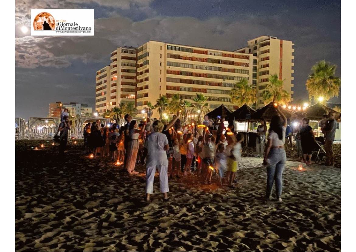 70 i partecipanti tra bambini e ragazzi tutti in maglia bianca, scarpette da ginnastica ,pettorina con stelle rifrangenti e lucina led fornita dall'organizzazione. Un lunghissimo e festoso corteo partito dai “Lido Senza Barriere”, alle ore 21,45 capeggiato da Chiara Di Benedetto, Anna Di Gennaro, Bruna Brunetti, Cassandra Marchigiani, Tecla Cecamore, Eliseo Di Benedetto, Denis Capozio, Alberto Falasca, Silvio Ciarma e da Renato Petra Presidente dell'Associazione Amare Montesilvano. Il corteo è transitato in un percorso preparato ad hoc sulla spiaggia dall'organizzazione con delle lanterne luminose accese e ha iniziato una serie di movimenti, figure e cerchi con le lucine accese che sembravano tante “stelle”ad un certo punto della spiaggia si è accesa una enorme stella 4x4 mt. con la sorpresa dei bambini ma di tutti i numerosi presenti. Questa grande stella, sorretta da Alberto e Renato, ha preso la testa del corteo che dopo aver transitato sulla via A. Moro a suon di musica accolta dalle artiste al Teatro del Mare. Giunti al palco, i bambini si sono schierati in un grande cerchio ed alcuni di loro hanno recitato piccoli aforismi sulla notte di San Lorenzo. Alcuni nomi dei bambini partecipanti... simone surdo, simone ed emanul petra, greta e gaia palestini, nicole mosca, cloe ziccardi, emm acosta, edoardo e emanuele valentini,ziviello raffaello, greta e niccolo’ finocchio, sofia ed elena grilli, martina e mattia castellano, tommaso mancini, fantauzzi riccardo, lorenzo de chiara.
